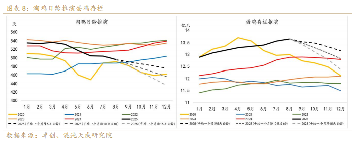 我们以2020年5月的淘汰日龄460天视作有效去化开始,假设当下淘鸡日龄每月递减5天、10天、15天,推演了25年四季度三种可能发生的情况:1.如果淘鸡不积极,日龄每月递减5天,那么年底存栏量接近今年6月水平,大约13.4亿羽;2.如果淘鸡日龄每月递减10天,存栏量依旧会大于24年年底,大约13.1亿羽;3.如果日龄递减15天,存栏量小于24年年底,大约12.8亿羽。