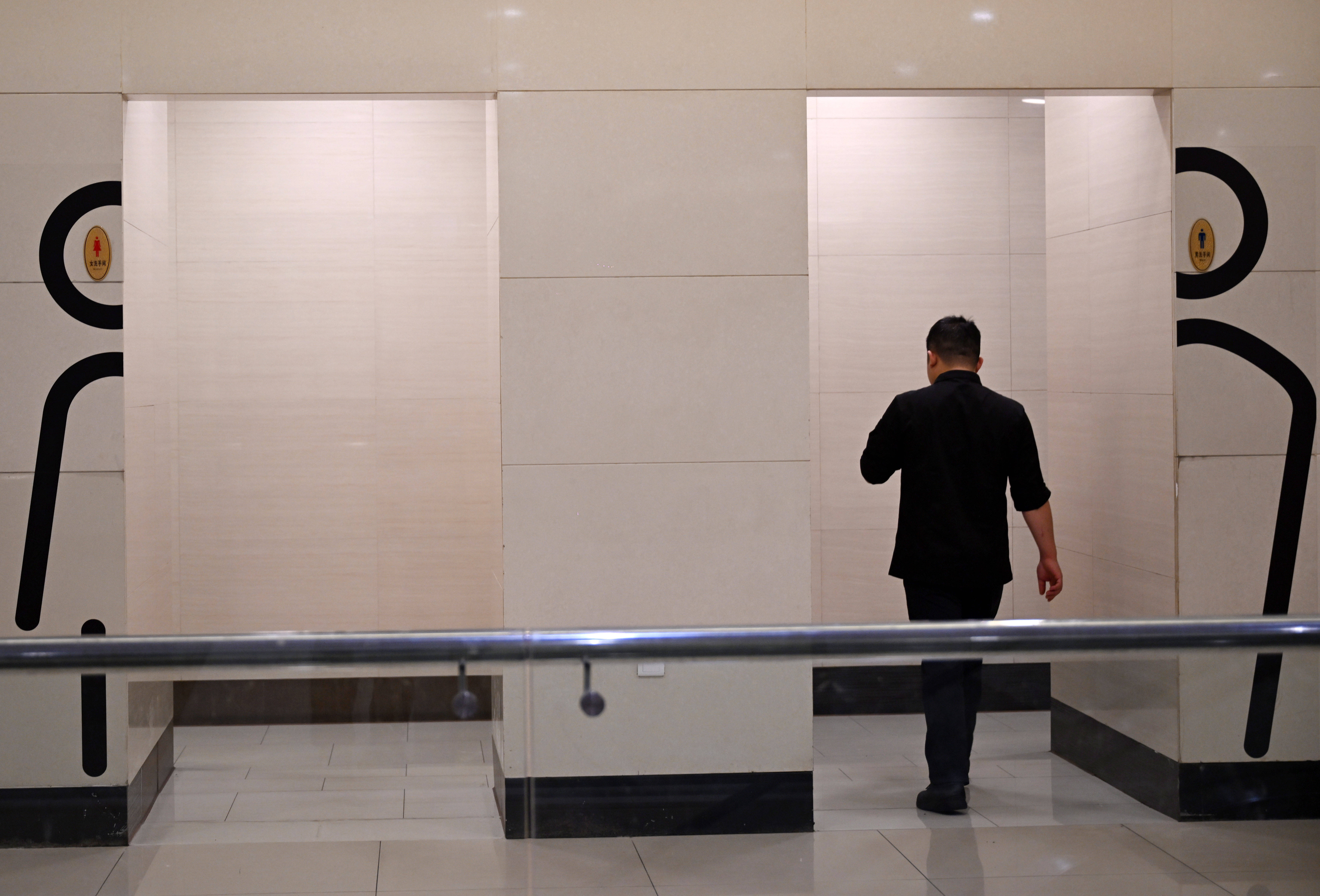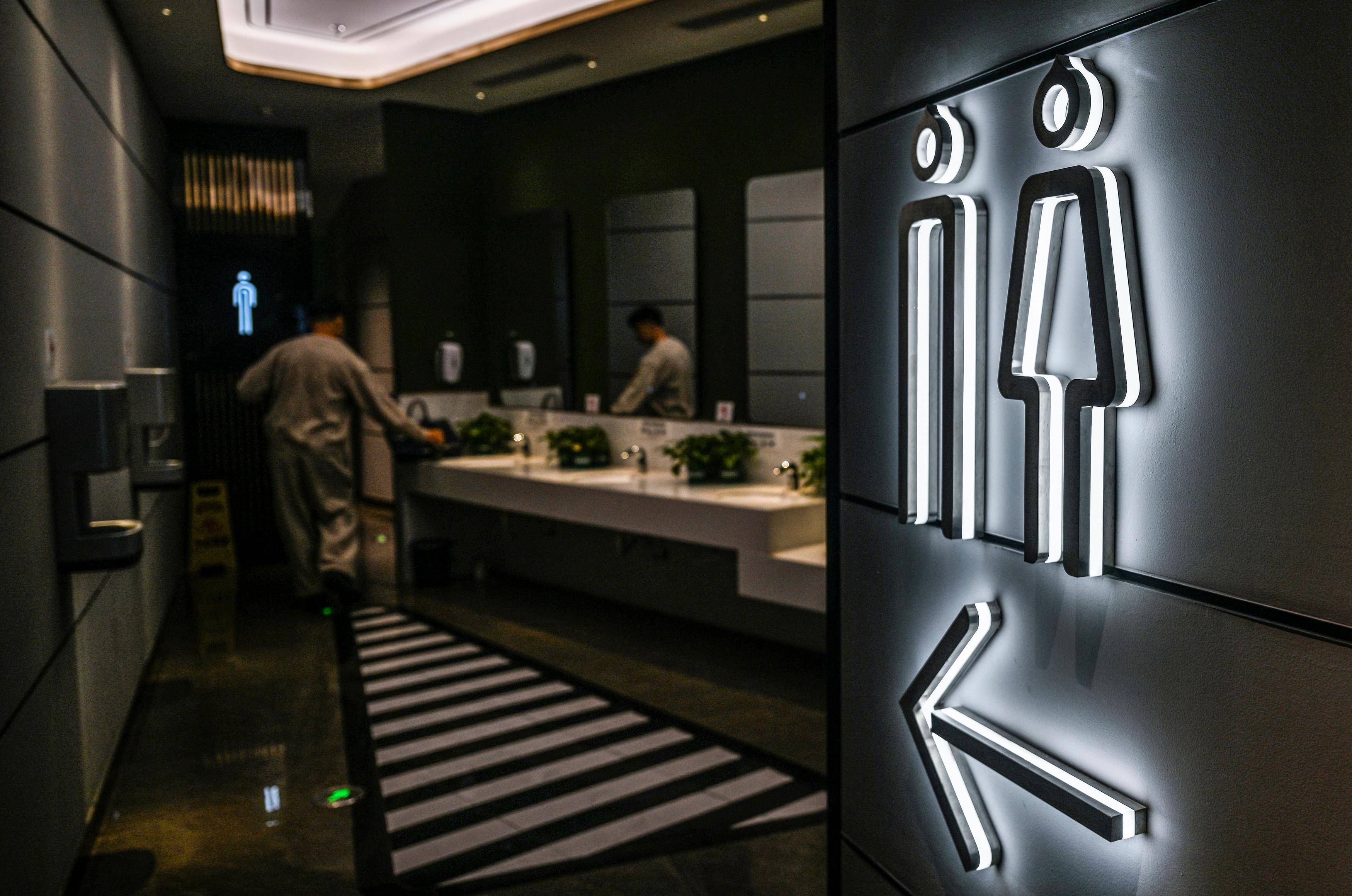 10月19日,在重庆市两江新区一商场,顾客如厕前观察卫生间标识。重庆大学公共管理学院教授彭小兵认为
